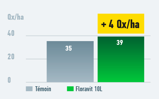 Les expérimentations sur blé en parcelles comparatives ont mis en évidence une augmentation du rendement de 7 à 13 qx/ha pour un apport de 5 à 10L/ha de Floravit®, avec un retour sur investissement de 170 à 280€/Ha*. L’optimisation de l’assimilation des engrais permet de réduire de 20% l’apport des unités d’azote.